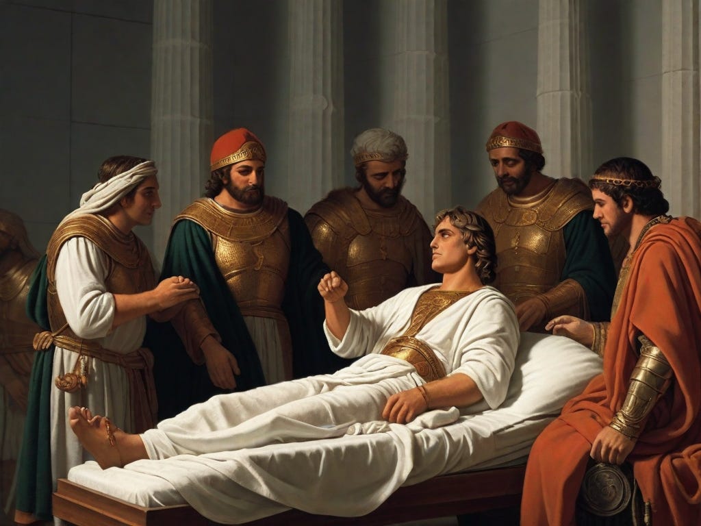 "Physicians," he began, "I have led armies to victories across lands, but today I face a battle within myself that even the mightiest army cannot conquer. My time in this world is nearing its end." 🌅