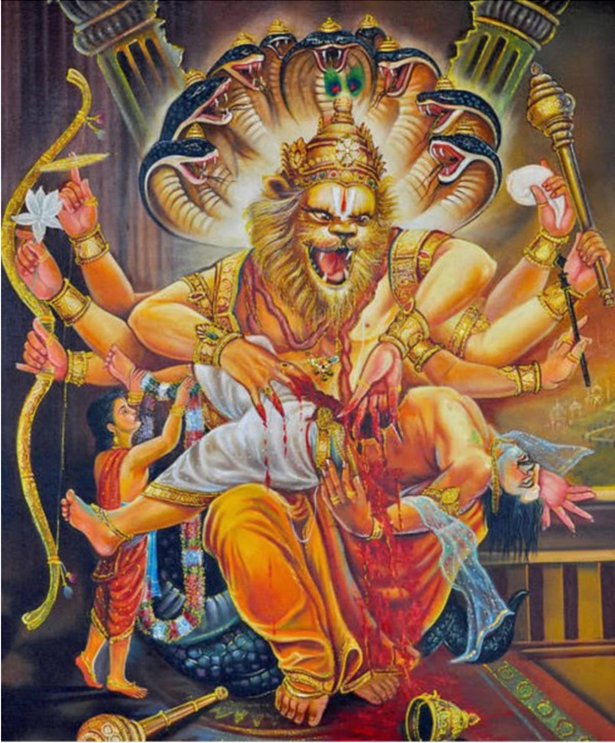 With unparalleled grace, Narasimha lifted Hiranyakashipu and carried him to the fort's threshold — neither inside nor outside. The divine avatar killed the demon king using neither metal nor wood but his lion claw nails.